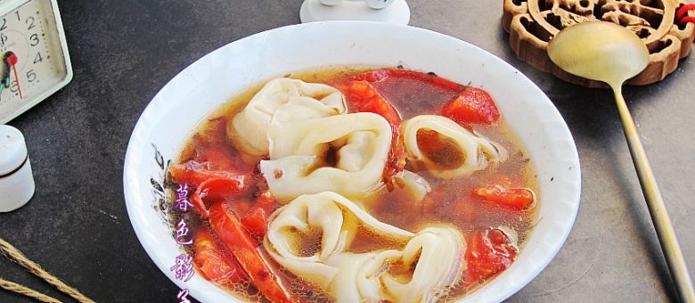 食材;馄饨皮,猪肉馅,虾仁,植物油,盐,蚝油,西红柿1个,鸡精,香油。