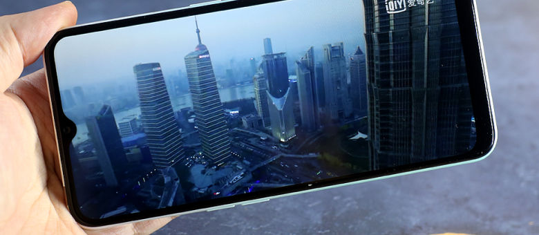 相对于刘海屏,水滴屏的设计缩小了刘海区域的面积,前置800万像素自拍镜头,支持面部解锁啥的,看起来还算清爽。整个正面采用了全面屏设计,分辨率720P,屏占比差不多89%,细长的机身设计,持握感还算不错。